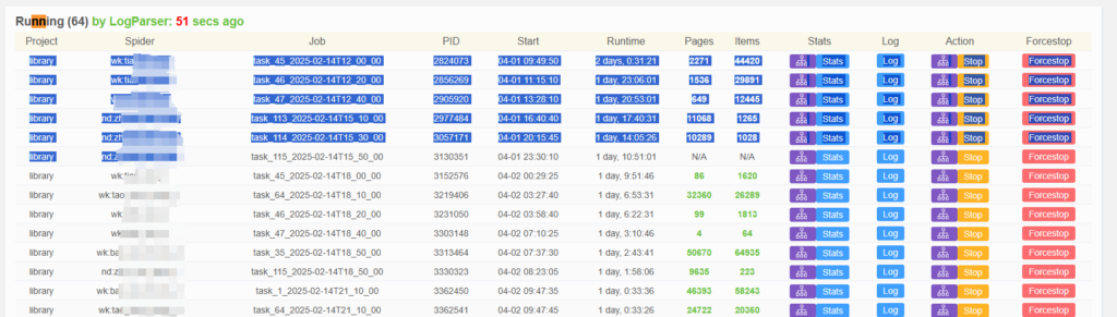 library	wk:xxx	task_47_2025-02-14T06_40_00	2652661	04-01 02:09:00	2 days, 7:56:57	3210 0	 Stats	Log	 Stop	Forcestop